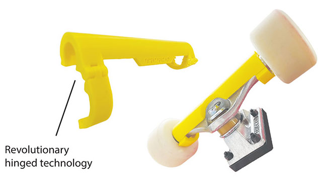 Snap N’ Grind has crafted a skateboard accessory that lets skaters grind smoothly on asphalt, concrete, coping, and metal. Featuring a proprietary, hinged design, the coper snaps onto the truck, enhances the grind glide and protects your equipment from structural damage. Developed and field tested by experienced skaters, these copers promise durability and performance.